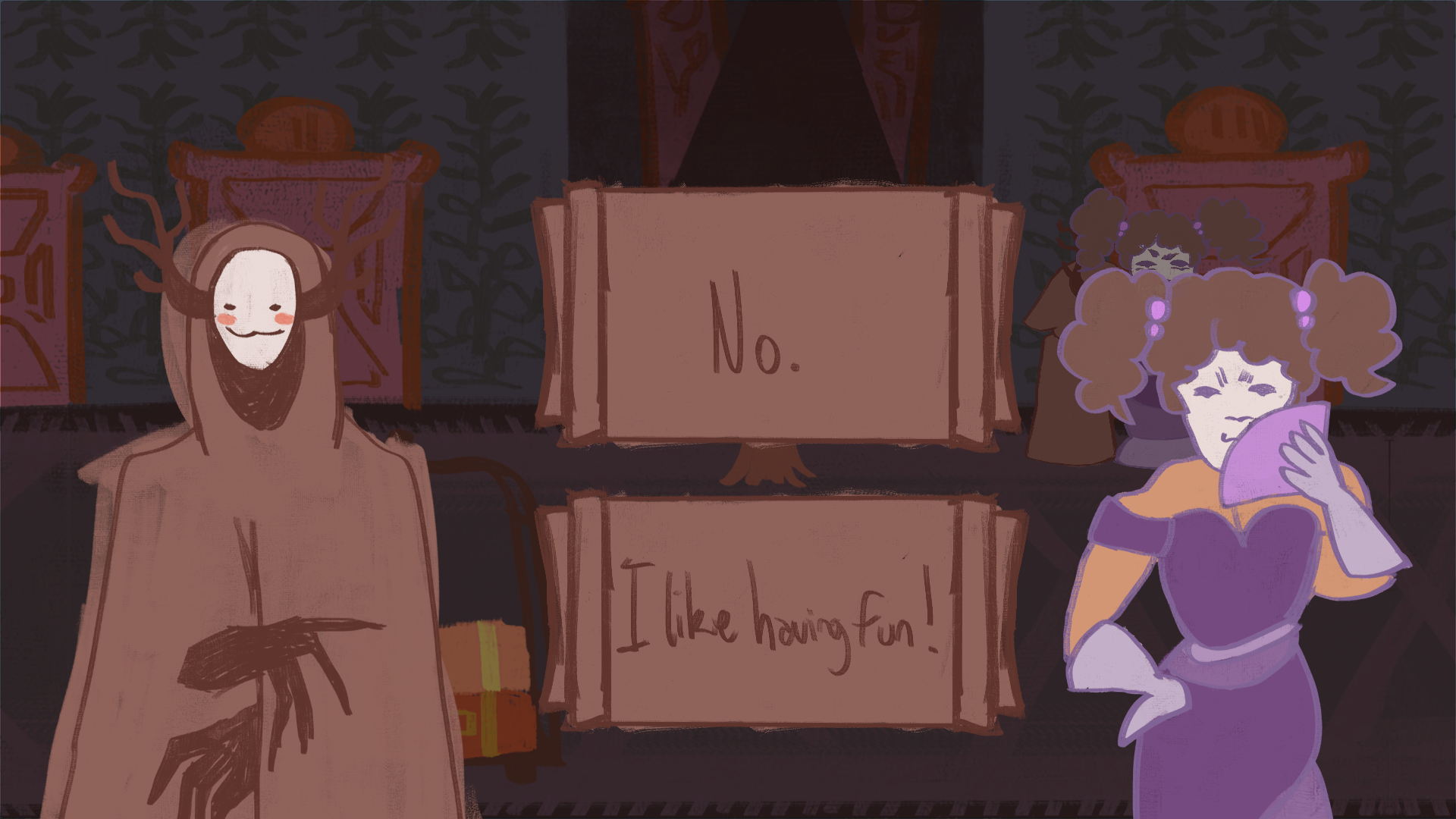 Help Def von Noe navigate a mysterious hotel full of masked people to find his client, while keeping your identity as a grim reaper a secret!